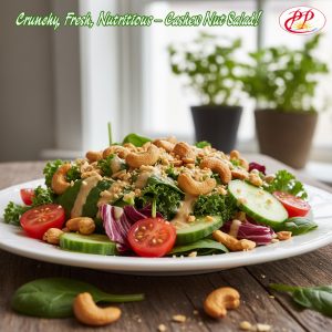 Salad hạt điều là một món ăn nhẹ và thanh đạm, đầy đủ chất dinh dưỡng. Bạn có thể kết hợp hạt điều với các loại rau củ như cà chua, dưa leo, rau xà lách và một ít nước sốt dầu ô liu, gia vị cho vừa miệng. Hạt điều sẽ cung cấp độ giòn tự nhiên, bổ sung chất béo lành mạnh và giúp món salad thêm phần hấp dẫn và dinh dưỡng.
